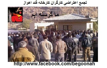 بنابه گزارش خبرگزاري حكومتي ايلنا , بيش از ۷۰ نفر از كارگران گر کارخانه قند و تصفيه شکر اهواز، صبح امروز -۱۷دي ماه- براي چندمين بار طي سال جاري در اعتراض به عدم دريافت حقوق و مزايا و ساير مطالبات ۲۵ ماهه خود در مقابل درب ورودي ساختمان استانداري خوزستان تجمع کردند.