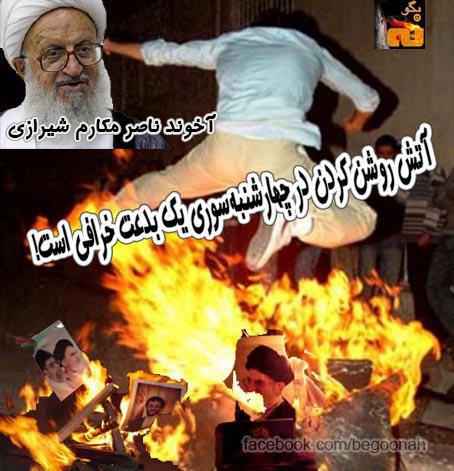 ناصر مکارم شيرازی، :آتش روشن کردن در چهارشنبهسوری يک بدعت خرافی است مخصوصاً با گفتن اين جمله که «سرخی تو از من، زردی من از تو» اينها خرافات است.»