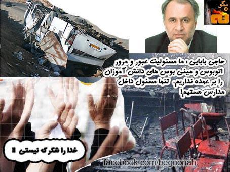 به گزارش شبکه خبر، حاجی بابایی در مراسم «گرامیداشت هفته هوای پاک» در پاسخ به این سوال که آیا شما مسئولیت اتفاقاتی را که در مدارس رخ میدهد، میپذیرید؟ گفت: هر اتفاقی که در مدارس رخ دهد، نخستین مسئول آن شخص وزیر است، اما آنچه که در خارج از مدارس اتفاق میافتد بر عهده ما نیست.