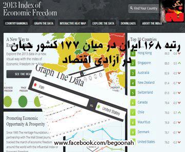 سال ٢٠١٢ نیز ایران از میان ١٧٩ کشور رتبە ١٧١ را بە خود اختصاص دادە بود. برای تشخیص «آزادی اقتصادی» دە فاکتور مورد ارزیابی قرار میگیرد کە عبارتند از: آزادی تجاری، آزادی مشاغل، آزادی مالی، بزرگی دولت، آزادی پولی، آزادی سرمایەگذاری، آزادی نظام مالی، حقوق داراییها، عدم فساد اقتصادی و آزادی بازار کار.