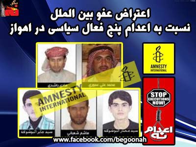 سازمان عفو بین الملل روز شنبه ۱۹-۱-۲۰۱۳ با صدور بیانیه ای، تایید حکم اعدام پنج فعال ایرانی را در اهواز محکوم کرد و خواستار محاکمه عادلانه آنها شد.
