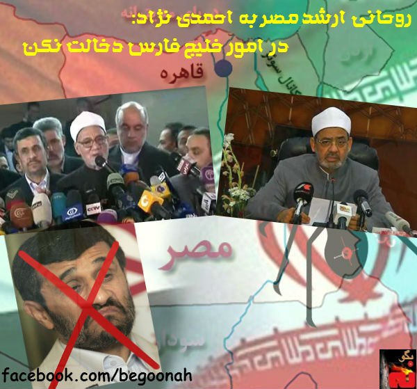 خبرگزاری فرانسه از مفتضح شدن رژيم ايران در سفر احمدی نژاد به مصر خبر داد و گفت: روحانی ارشد مصر روز سه شنبه در ديدار با محمود احمدی نژاد، گفت که در امور بحرين يا خليج فارس دخالت نکند و به حقوق اقليت کشور خودش احترام بگذارد. علاوه براين؛ طيب، امام الازهر، دانشگاه برجسته مسلمانان در مصر طی بيانيه يی آنچه را به عنوان ”نفوذ شيعی در سرزمينهای سنی ”توصيف می کرد؛ محکوم نمود.