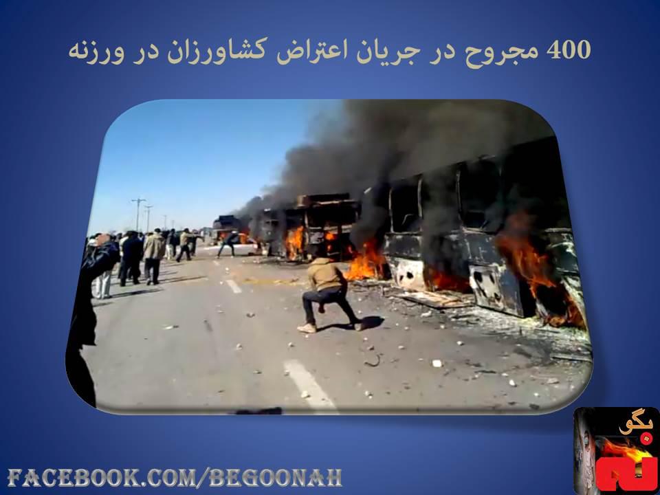در ورزنه در تجمع اعتراضی مردم ورزنه از روز پنج شنبه 91.12.10 مردم از ساعت 6-7 صبح بيش از هزار نفر در ورودي ورزنه تجمع كردند.در ورزنه از روز چهارشنبه شب 91.12.9 ودرخلال قيام كشاورزان 400 نفر مجروح شده اند. دراين بين 7 نفر به علت اصابت گلوله هاي ساچمه اي كه مستقيم به چشم مي زده اند كورشده
