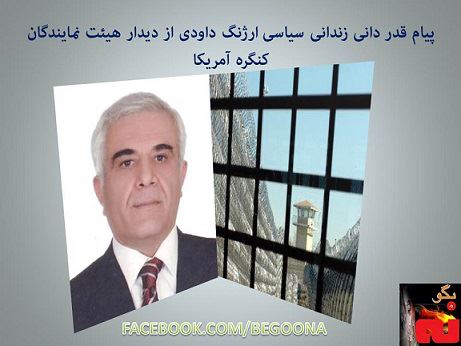 پیام زندانی سیاسی ارژنگ داودی به هیئت کنگره آمریکا که اخیرا ملاقاتی در پاریس با شورای ملی مقاومت داشته و پشتیبانی خود را از آزادیخواهان و دمکرات جویان ایرانی نموده است که جهت ارسال به اعضای هیئت ملاقات کننده کنگره و انتشار در رسانه های در اختیار « فعالین حقوق بشر و دمکراسی در ایران» قرار داده شده است.