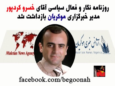 اخبار روزنامە نگار و فعال سیاسی آقای خسرو کردپور مدیر خبرگزاری موکریان بازداشت شد Date: مارس 7, 2013Author: begoonah 0 دیدگاه . اشتراکگذاری این:بیشتر برای اشتراکگذاشتن فیسبوک خود کلیک کنید (در پنجرۀ تازه باز میشود) فیسبوک اشتراک گذاشتن توسط اس ام اس (در پنجرۀ تازه باز میشود) X برای چاپ کردن کلیک کنید (در پنجرۀ تازه باز میشود) چاپ برای اشتراکگذاری روی Telegram کلیک کنید (در پنجرۀ تازه باز میشود) تلگرام برای اشتراکگذاری روی WhatsApp کلیک کنید (در پنجرۀ تازه باز میشود) واتساپ
