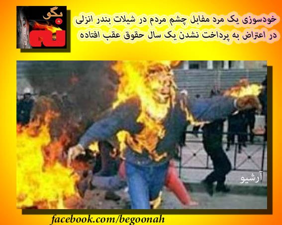 یک مرد ۴۲ساله در شيلات بندر انزلی روز شنبه۲۸ بهمن در اعتراض به پرداخت نشدن يک سال حقوق عقب افتاده، در مقابل چشمان مردم خود را به آتش کشيد.