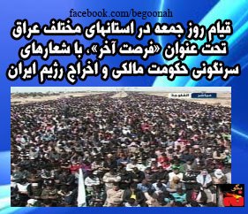 تظاهرکنندگان شعارهای الله اکبر، مرگ بر رژیم آخوندی و مرگ بر مزدوران این رژیم و زنده باد عراق سردادند. در تظاهرات روزجمعه در موصل مرکز استان نینوا، نیروهای مالکی به روی تظاهر کنندگان درمیدان احرار آتش گشودند که در اثر آن شماری از تظاهرکنندگان به شهادت رسیده و مجروح شدند. برخی از کسانی که پیکر شهدا را حمل می کردند، به تشدید وضعیت تهدید میکردند و میگفتند ما خواستار آزادی این زندانی شده بودیم، ولی این نیروهای امنیتی هستند که وضعیت را تشدید کردند. یکی از سخنرانان تحصن موصل به مالکی هشدار داد و گفت تو نیز به سرنوشت ستمگرانی که قبل از تو بودند دچارخواهی شد ، به سرنوشت آنها نگاه کن.
