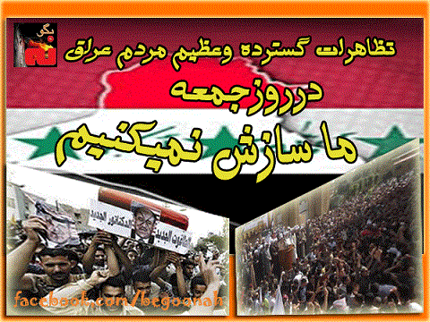 تظاهرات گسترده و عظيم مردم عراق در جمعه «سازش نمی کنيم»؛ با شعار «الشعب يريد اسقاط النظام»، مردم سرنگونی نظام را می خواهند در شهرهای مختلف عراق شروع شده است. به گزارش تلويزيون التغيير تظاهرات روز جمعه موصل با شعار «سازش نمی کنيم» آغاز شد و تظاهر کنندگان به سمت ميدان تحصن الاحرار موصل در حرکتند. تلويزيون بغداد گزارش داد مردم در بغداد به سمت اماکن نماز وحدت می شتابند… گزارشهای دریافتی شهرهای بغداد، رمادی، فلوجه، حديثه، موصل، سامراء، تکريت، سليمان بک، کرکوک، حويجه، بعقوبه، جلولا، قره تپه، مقداديه، منصوريه، بلدروز، بيجی و ضلوحيه از جمله مراکز برگزاری سلسله تظاهرات امروز در عراق بودند.