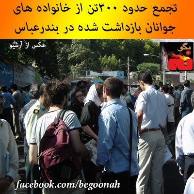 اخبار تجمع حدود ۳۰۰تن از خانواده های جوانان بازداشت شده در بندرعباس Date: آوریل 5, 2013Author: begoonah 0 دیدگاه بنا به گزارشهای دريافتی روز چهارشنبه 14 فروردين، حدود 300تن از خانواده های جوانان بازداشت شده در بندرعباس و همچنين خانواده های زندانيان، در ساختمان بيدادگاه رژيم در اين شهر تجمع کردند. آنها به شرايط وخامت بار بستگان دربندشان اعتراض کردند. اشتراکگذاری این:بیشتر برای اشتراکگذاشتن فیسبوک خود کلیک کنید (در پنجرۀ تازه باز میشود) فیسبوک اشتراک گذاشتن توسط اس ام اس (در پنجرۀ تازه باز میشود) X برای چاپ کردن کلیک کنید (در پنجرۀ تازه باز میشود) چاپ برای اشتراکگذاری روی Telegram کلیک کنید (در پنجرۀ تازه باز میشود) تلگرام برای اشتراکگذاری روی WhatsApp کلیک کنید (در پنجرۀ تازه باز میشود) واتساپ