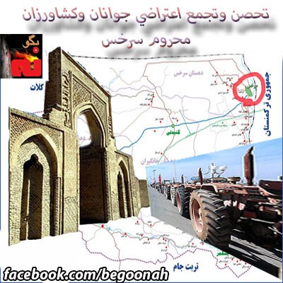 بدنبال تصرف زمينهاي كشاورزي درشهرستان سرخس دراستان خراسان شمالي كه آخوند طبسي جنایتکار تحت پوش آستان قدس رضوي،سالها است اقدام به آن كرده ،تقريبااز 5 روز پيش جوانان وكشاورزان واهالي روستاهاي اطراف شهرستان سرخس در خراسان شمالي دست به تحصن وتجمع اعتراضي در نزديكي مرزبين سرخص وتركمنستان زده اند وتهديد كرده اند كه اگر به خواسته هاي آنها رسيدگي نشود از دست ظلم وبيداد رژيم آخوندي به تركمنستان پناه ميبرند. لازم به ياد آوري است كه رژيم ازهمان ابتداي انقلاب درسال 57 شروع به حق خوري نسبت به كشاورزان محروم كرد وزمينهاي حاصلخيز اين كشاورزان را تحت پوش آستان قدس رضوي به نام خودكرده است كه آخوند طبسي جانی نماينده خامنه ای جلاد درخراسان دراين دزدي وچپاول نقش اول را بعهده دارد، درپي تجمع اعتراضي جوانان از روز جمعه 16 فروردين حدود 200 نيروي سركوبگرضد شورش از مشهد به سرخس اعزام شده اند كه با جوانان وكشاورزان دست به مقابله وسركوب بزنند، علي رغم اقدامات سركوبگرانه عوامل رژيم ، جوانان وكشاورزان ، دست به مقاومت زده اند وتجمع اعتراضي وتحصن جوانان وكشاورزان محروم همچنان ادامه دارد
