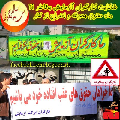 به گزارش يك فعال خبري از شيراز ، روز دوشنبه نزديك به 180 كارگر اخراج شده از كارخانه بسيار معتبر و قديمي لوازم خانگي آزمايش مرودشت كه اكنون بيش از 11 ماه حقوق و مطالبات خود را طلب دارند و پيگييري هاي آنها تا كنون بي پاسخ مانده بود امروز دوشنبه 92.1.26 در يك تلاشي جديد اقدام به شكايت و طومار اعتراضي عليه كارفرما و دست اندركاران مربوطه نمودند و شكايت كارگران را نماينده آنها به اداره كار شهرستان مرودشت تحويل دزاد كارخانه آزمايش از فروردين ماه گذشته بطور كامل تعطيل گرديد و همه 180 كاارگر با قيمانده نيز اخراج گرديدند