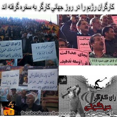 يكي از كارگراني كه در مراسم شركت كرده بود، ترفند رژيم براي ندادن حقوق آنها را افشا كرده و مي گفت:” اين ها(سران حكومت)ميخواهند خواست كارگران را جناحي سياسي و به انتخابات رژيم ربط دهند كه به اين وسيله حقوق ما را ندهند. فضاي امنيتي به شدت حكم فرمابود و دوربين هاي ورزشگاه در كل مراسم درحال چرخش بودند وهمه چيز را زير نظر مامورين لباس شخصي بود