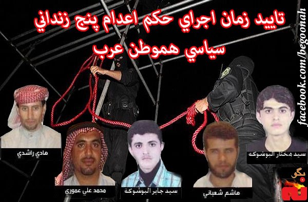 هاشم شعبانينژاد، شاعر، وبلاگنويس، دبير ادبيات عرب و دانشجوي فوق ليسانس علوم سياسي دانشگاه چمران اهواز، هادي راشدي، دبير شيمي و فوق ليسانس شيمي کاربردي، محمد علي عمورينژاد، فعال دانشجويي و عضو سابق انجمن اسلامي دانشگاه صنعتي اصفهان و وبلاگنويس، به همراه دو تن ديگر به نامهاي جابر و مختار آلبوشوکه، پنج زنداني مورد اشاره هستند که در تاريخ ۱۷ تيرماه سال گذشته به اتهام محاربه با خدا و مفسد في الارض و تبليغ عليه نظام جمهوري اسلامي و اقدام عليه امنيت ملي توسط شعبه دوم دادگاه انقلاب اهواز به اعدام محکوم شدند و پس از آن اين حکم عينا به تاييد رسيد.