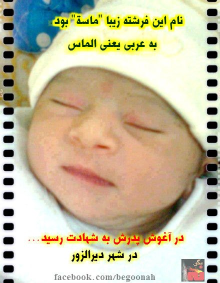 گالری فیلم و تصویر نام این فرشته زیبا «ماسة» بود. به عربی یعنی الماس. در آغوش پدرش به شهادت رسید… در شهر دیرالزور ازصفحه همبستگی با مردم سوریه Date: مِی 14, 2013Author: begoonah 0 دیدگاه اشتراکگذاری این:بیشتر برای اشتراکگذاشتن فیسبوک خود کلیک کنید (در پنجرۀ تازه باز میشود) فیسبوک اشتراک گذاشتن توسط اس ام اس (در پنجرۀ تازه باز میشود) X برای چاپ کردن کلیک کنید (در پنجرۀ تازه باز میشود) چاپ برای اشتراکگذاری روی Telegram کلیک کنید (در پنجرۀ تازه باز میشود) تلگرام برای اشتراکگذاری روی WhatsApp کلیک کنید (در پنجرۀ تازه باز میشود) واتساپ