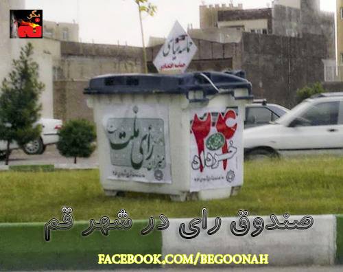 شهرداري شهر قم با هدف تشويق مردم براي حضور در يازدهمين دوره انتخابات ٬ يک سطل زباله را به عنوان صندوق راي در يکي از خيابانهاي اين شهر٬ تزئين و به نمايش گذاشته است. ناگفته پيداست كه شهرداري شهر قم نيز به درستي تشخيص داده است كه مسير و مقصد اين جماعت كانديداي خامنه اي جايي جز زباله دان تاريخ نيست