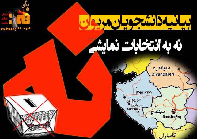 دانشجویان دانشگاههای مریوان و جمعی از فعالین سیاسی و مدنی این شهر، طی بیاننامەای انتخابات نمایشی رژیم ایران را تحریم نمودهاند.درین بیانیه آمده است: «هدف اصلی رژیم ایران کشاندن مردم به پای صندوقهای رای میباشد. رفتن به پای صندوقهای رأی مشروعیت به رژیم ایران میباشد، در همین رابطه از ملت کُرد درخواست میکنیم که در راستای منافع ملتمان حرکت کرده و ضمن عدم حضور در انتخابات، به رژیم ایران بفهمانیم که دشمن انسانیت و آزادی است و هیچ گونه مشروعیتی ندارد»