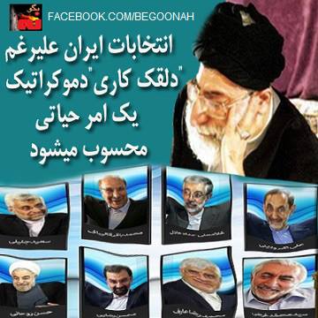 در ايران، رئيسجمهور، تابع و خدمتگذار رهبر عالي، آيتالله علي خامنهاي است. کانديداها ابتدا بايد توسط گروهي از آيتاللهها که شوراي نگهبان را تشکيل ميدهند، مورد تأييد قرار گيرند. اين آيتاللهها، همگي توسط خامنهاي دستچين شدهاند. تنها، مطيعترين و هم نواترين کانديداها مورد تأييد قرار ميگيرند.