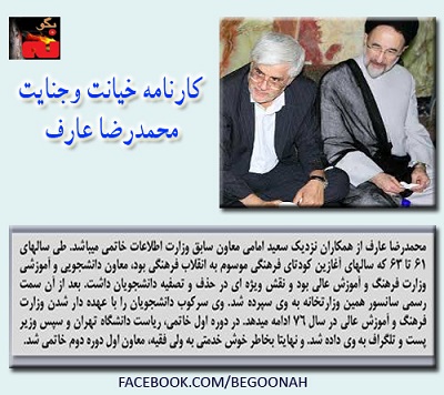 اخبار کارنامه خیانت وجنایت محمدرضا عارف Date: جون 13, 2013Author: begoonah 0 دیدگاه اشتراکگذاری این:بیشتر به اشتراک گذاشتن در فیسبوک (در پنجرۀ تازه باز میشود) فیسبوک اشتراکگذاری در X (در پنجرۀ تازه باز میشود) X چاپ (در پنجرۀ تازه باز میشود) چاپ اشتراکگذاری در تلگرام (در پنجرۀ تازه باز میشود) تلگرام اشتراکگذاری در واتساپ (در پنجرۀ تازه باز میشود) واتساپ