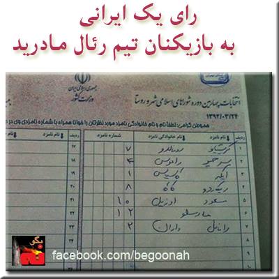 یکی از شهروندان تهرانی در اعتراض به انتخابات نمایشی رژیم در فهرست تعرفهای که باید نام نامزدهای شورای شهر را بنویسد به بازیکنان تیم فوتبال رئال مادرید از جمله کریستین رونالدو، مسعود اوزیل، کاسیاس، سرخیو راموس و…رای داده است!