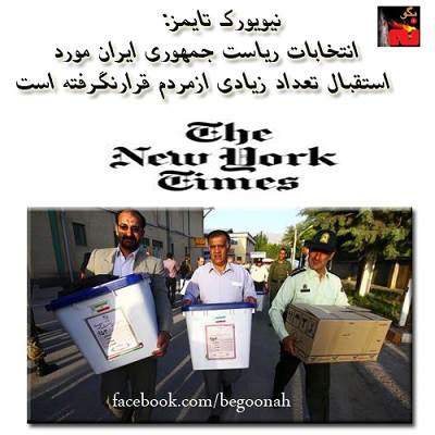 رزنامه نيويورک تايمز نوشت: انتخابات رياست جمهوری ايران مورد استقبال تعداد زيادی از مردم قرار نگرفته است. نيويورک تايمز افزود: تعداد بيشماری از جوانانی که بعد از انقلاب متولد شده اند در کشور خودشان احساس غريبی می کنند. . آنها در ترس از سرکوب يا بيکاری قرار دارند.
