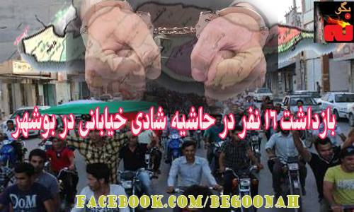 اخبار بازداشت ۱۶ نفر در حاشیه شادی خیابانی در بوشهر Date: جون 21, 2013Author: begoonah 0 دیدگاه بگفته پاسدار حیدر عباس زاده 16 نفر از جوانان بوشهری که پس از پیروزی تیم ملی مقابل کره جنوبی، به شادمانی پرداخته بودند توسط مزدوران رژیم بازداشت شدند. اشتراکگذاری این:بیشتر به اشتراک گذاشتن در فیسبوک (در پنجرۀ تازه باز میشود) فیسبوک Share on X (در پنجرۀ تازه باز میشود) X چاپ (در پنجرۀ تازه باز میشود) چاپ Share on Telegram (در پنجرۀ تازه باز میشود) تلگرام Share on WhatsApp (در پنجرۀ تازه باز میشود) واتساپ