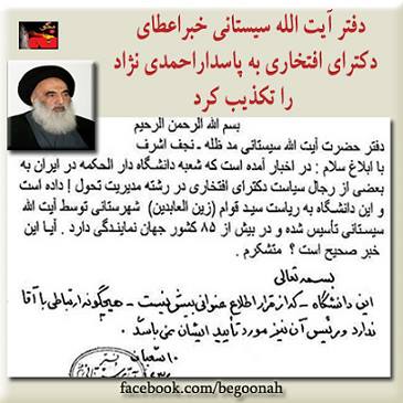 در جلسه اخیرکارگزاران رژیم که صبح روز چهارشنبه ۱۹-۶-۲۰۱۳ توسط پاسدار احمدینژاد برگزار شد، در اتفاقی جالب به احمدینژاد از سوی دانشگاهی که ادعا شده بود توسط آیت الله سیستانی تاسیس شده، دکتر افتخاری اهداء شد.