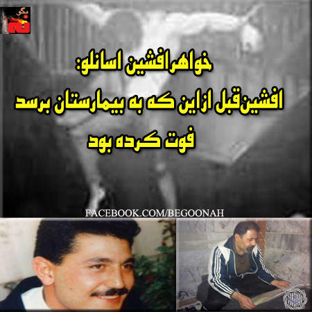 خواهر افشين اسانلو که در زير شکنجه دژخيمان گوهردشت جان باخت، گفت: برادرش افشين پنجشنبه ساعت هشت شب به بيمارستان رجايی منتقل شده اما قبل از اين که به بيمارستان برسد، فوت کرده بود. با اين حال پزشکان با توجه به جوانی او يک ساعت برای احيای او تلاش می کنند که به جايی نمی رسد. به گفته خواهر افشين اسانلو او يک هفته پيش از مرگ، با مادرش ملاقات حضوری داشته و در اين ملاقات کاملاً سالم بوده است..