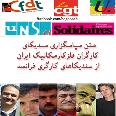 ضمن سپاسگزاری از همبستگی کارگریتان با مبارزات کارگران ومردم ایران که در اجلاس ILO تجلی یافت وباسازماندهی شما اعتراض کارگران ایران به نقض قوانین انسانی و کارگری ومقاوله نامه های ۹۸ و۸۷ وهمچنین اعتراض شما از جانب ما به حضورنمایندگان به اصطلاح کارگری ایران وپخش اعلامیه های اعتراضی در اجلاس،مایلیم درودهای کارگری خود را به شما خواهران و براداران عضو ث.ژ.ت ،سود، اونسا، اف اس یو، اس اف د. ت.وشورای مرکزی تان اعلام کنیم.