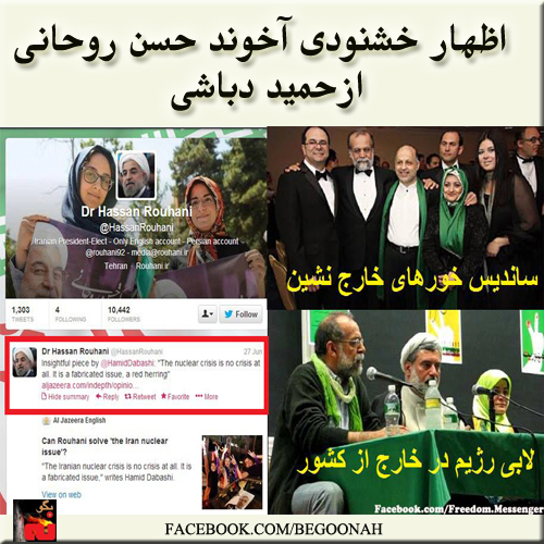 حسن روحانی در توئیتر خود به زبان انگلیسی، از مقاله اخیر حمید دباشی تعریف کرده و آنرا موشکافانه خوانده است. دباشی با شروع جنبش سبز وارد صحنه سیاسی شد، دو سالی فعالیت کرد تا جنبش در چهارچوب نظام باقی بماند و بعد غیبش زد. اکنون با ظهور روحانی، دباشی و شرکاء نیز برای دفاع از نظام وارد صحنه شده اند.