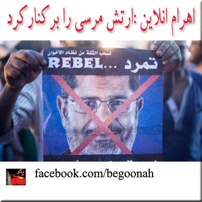 به گزارش اهرام آنلاین، که بخش انگلیسی زبان روزنامه دولتی الاهرام مصر است، یک منبع ریاست جمهوری به الاهرام عربی گفته است که در ساعت ۷ بعد از ظهر روز چهارشنبه به وقت قاهره ارتش به محمد مرسی ابلاغ کرده است که او دیگر رئیس جمهوری مصر نیست.»