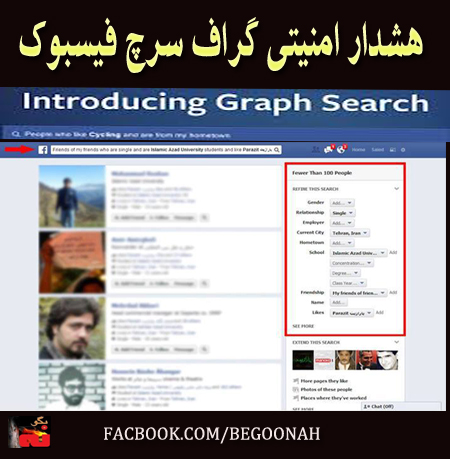 امكان گرافسرچ مىتونه براى بعضى از كاربران بسيار خطرناک باشه چراكه اگر تنظيمات امنيتى درستى نداشته باشيد، مىشه از اين قابليت بعنوان ابزار جاسوسى براى كسب اطلاعاتى مثل آدرس محل كار/ اقامت/ تحصيل، گرايش سياسى و دينى و غيره استفاده كرد. براى مثال من مىتونم سرچ كنم از بين دوستهاى دوستانم، چه كسانى در دانشگاه ميلان در حال تحصيل هستند و …. و يا چه كسانى در دانشگاه بابل درس خوندن و …. براى دسترسى به اين اطلاعات، حتما لازم نيست كه طرف در ليست دوستان من وجود داشته باشه.
