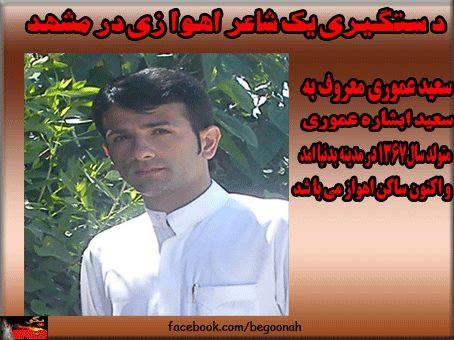 آقای سعيد عموري که مدتي پيش براي شركت در يك برنامه ادبي و شعر به استان خراسان در شهر مشهد دعوت شده بود,روز سهشنبه ۱۸ تیر پس از پايان مناظره ادبي و شعر در هنگام خروجش از صحن غدير در اطراف حرم رضوي توسط نيروهاي امنيتي دستگير شد.
