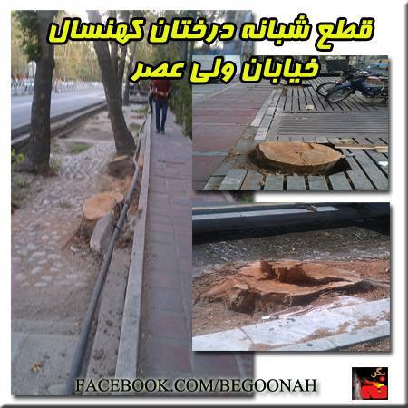 بتازگی شهرداری تهران اقدام به قطع شبانه درختان کهنسال خیابان ولی عصر تهران کرده، که بعضی از آنها حدود ۷۰ سال قدمت دارند.