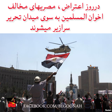 بسیاری از مصری های مخالف اخوان المسلمین در پاسخ به فراخوان ژنرال عبدالفتاح سیسی امروز جمعه 26-7-2013 به منظور برپایی تظاهرات میلیونی جهت حمایت از اقدامات ارتش این کشور و دادن مجوز به وزیر دفاع به منظور برخورد با خشونت و تروریسم به میدان تحریر قاهره در حال حرکت هستند.