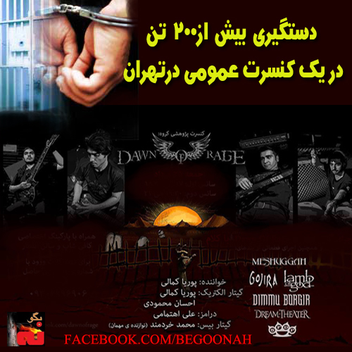 بنا به اطلاع گزارشگران هرانا، پلیس تهران در مراجعه به سالن آمفی همایش مهر آفرینش، محل برگزاری کنسرت گروه «Dawn of Rage»T بیش از ۲۰۰ تن از شرکت کنندگان و اعضای این گروه را بازداشت کرد.