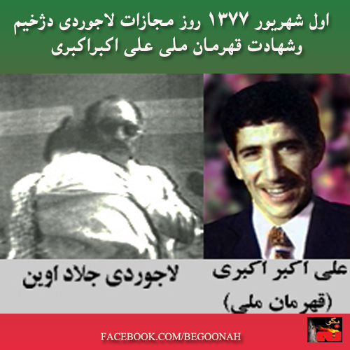 روز اول شهریور سال 1377 اسدالله لاجوردی سردژخیم شكنجهگاههای خمینی و قساوتپیشهترین جلاد تاریخ ایران و از آمران و عاملان شكنجه و قتل هزاران زندانی سیاسی، مجازات شد و توسط قهرمان ملی ایران علی اكبر اكبری با شلیك یك گلوله در مغزش از پای درآمد و در زبالهدان تاریخ جای گرفت.