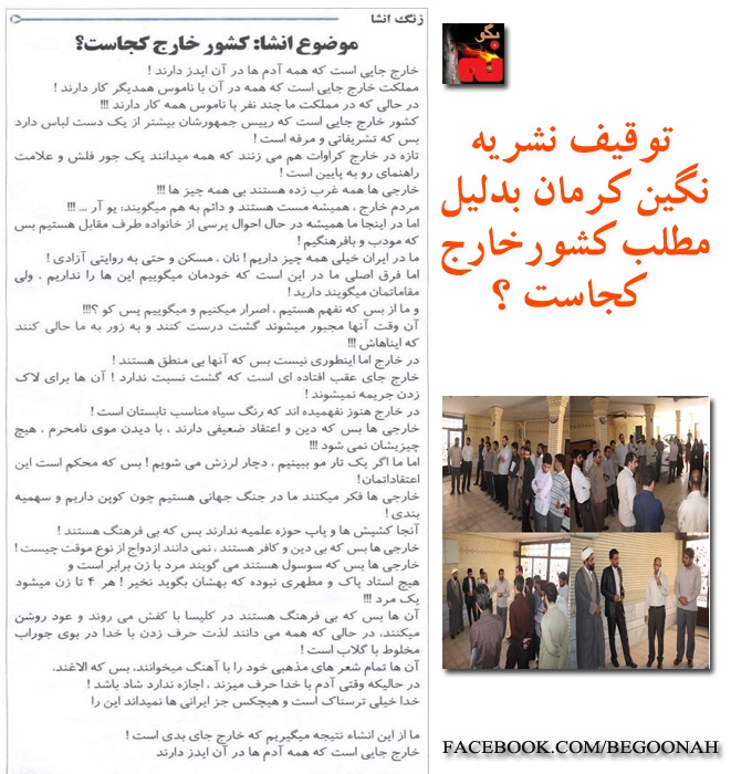 نشریه «نگین کرمان» در شماره روز ۲۳ مرداد ماه خود مطلبی با عنوان «کشور خارج کجاست؟» منتشر کرده که این مطلب با خشم محافظهکاران این استان مواجه شده است.