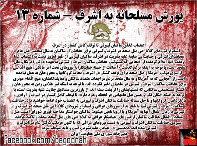 بدنبال پنجمين قتل عام مجاهدان اشرفي و جنايت بي سابقه عليه بشريت در اشرف، ساكنان ليبرتي از ظهر امروز دست به اعتصاب غذا زدند. آنها اعلام كردند: از آنجايي كه مسئوليت حفاظت ساكنان اشرف و ليبرتي به عهده دولت آمريكا و ملل متحد است، با توجه به اينكه برغم گذشت 10 ساعت از حمله جنايتكارانه نيروهاي تحت امر مالكي، هيچ اقدامي از سوي دولت آمريكا و ملل متحد براي توقف كشتار در اشرف و نجات گروگانها و مجروحان به عمل نيامده است، از آنجايي كه نه آمريكا و نه ملل متحد برغم مراجعات متعدد ساكنان و نمايندگانشان، هيچ اقدام موثري براي حفاظت ساكنان اشرف و ليبرتي در ماههاي اخير نكرده اند، با توجه به اينكه تير خلاص زدن به مجروحان و كشتار دستجمعي ساكناني كه دستهايشان را از پشت بسته اند، از بارزترين مصاديق جنايت عليه بشريت است، با توجه به اينكه امكان تكرار چنين قتل عامهايي هر لحظه وجود دارد، تا توقف كامل كشتار در اشرف و آزادي و بازگرداندن گروگانها و تا حل مساله حفاظت ساكنان اشرف و ليبرتي به اعتصاب خود ادامه خواهند داد. حفاظت ساكنان اشرف و ليبرتي تنها با خلع يد از نيروهاي عراقي و استقرار نيروهاي كلاه آبي ملل متحد در اشرف و ليبرتي تا زمان انتقال آنها به آمريكا و يا اروپا تامين ميشود. ساكنان خواستار مداخله فوري شوراي امنيت ملل متحد و انتقال حفاظت ساكنان از نيروهاي جنايتكار عراقي به كلاه آبي هاي ملل متحد شدند و تاكيد كردند سپردن حفاظت ساكنان اشرف و ليبرتي به دست نيروهاي عراقي كه تا كنون مرتكب 5 قتل عام در اشرف و ليبرتي شده اند، همدستي در جنايت عليه بشريت است و بايد متوقف شود.
