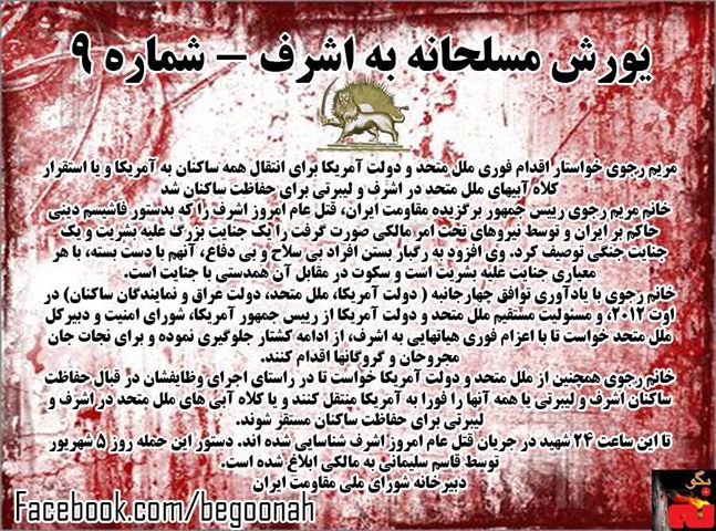 خانم مريم رجوي رييس جمهور برگزيده مقاومت ايران، قتل عام امروز اشرف را كه بدستور فاشيسم ديني حاكم بر ايران و توسط نيروهاي تحت امر مالكي صورت گرفت را يك جنايت بزرگ عليه بشريت و يك جنايت جنگي توصيف كرد. وي افزود به رگبار بستن افراد بي سلاح و بي دفاع، آنهم با دست بسته، با هر معياري جنايت عليه بشريت است و سكوت در مقابل آن همدستي با جنايت است.
