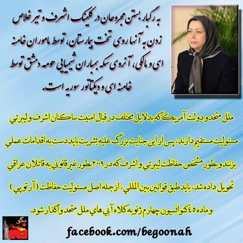 رئيس جمهور برگزيده مقاومت تاكيد كرد ملل متحد و دولت آمريكا كه بدلايل مختلف در قبال امنيت ساكنان اشرف و ليبرتي مسئوليت مستقيم دارند، پس از اين جنايت بزرگ عليه بشريت بايد دست به اقدامات عملي بزنند و بطور مشخص حفاظت ليبرتي و اشرف كه در 2009 بطور غيرقانوني به قاتلان عراقي تحويل داده شد، بايد طبق قوانين بين المللي، از جمله اصل مسئوليت حفاظت ( آر تو پي ) و ماده 45 كنوانسيون چهارم ژنو به كلاه آبي هاي ملل متحد واگذار شود.