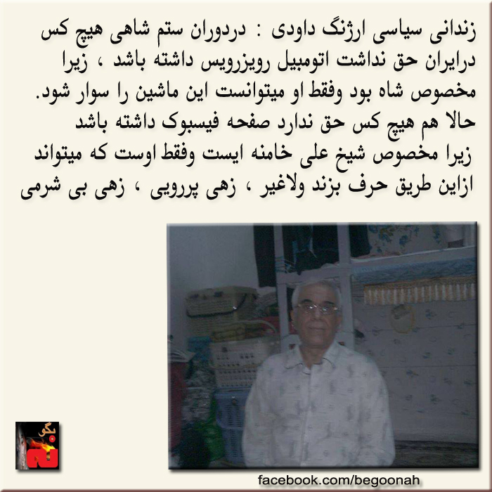 گالری فیلم و تصویر زندانی سیاسی ارژنگ داودی Date: سپتامبر 19, 2013Author: begoonah 0 دیدگاه اشتراکگذاری این:بیشتر برای اشتراکگذاشتن فیسبوک خود کلیک کنید (در پنجرۀ تازه باز میشود) فیسبوک اشتراک گذاشتن توسط اس ام اس (در پنجرۀ تازه باز میشود) X برای چاپ کردن کلیک کنید (در پنجرۀ تازه باز میشود) چاپ برای اشتراکگذاری روی Telegram کلیک کنید (در پنجرۀ تازه باز میشود) تلگرام برای اشتراکگذاری روی WhatsApp کلیک کنید (در پنجرۀ تازه باز میشود) واتساپ