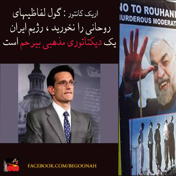اريک کانتور رهبر اکثريت جمهوريخواهان مجلس نمايندگان آمريکا گفت: رژيم ايران به رغم لفاظيهای روحانی يک ديکتاتوری مذهبی بيرحم و سرکوبگر است. وی به باراک اوباما اعتراض کرد که چرا به حمايت رژيم ايران از گروه های افراطی و نقض حقوق بشر توجه نکرده است. اريک کانتور گفت اگر آمريکا فکر کرده است روحانی وفادار به خامنه ای نيست خودش را گول زده است.