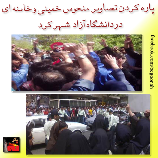 بنا به گزارشات رسیده دانشجويان دانشگاه آزاد شهر کرد، روز يکشنبه 14مهر تصاوير منحوس خمينی و خامنه ای را در اين دانشگاه پاره کردند و قاب اين تصاوير منحوس را شکستند