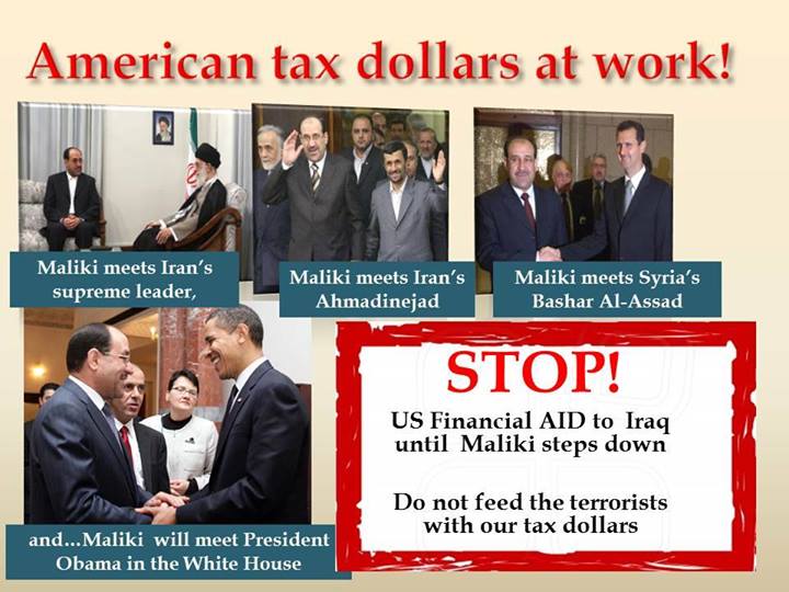 President Obama, Nouri Al-Maliki of Iraq is a puppet of the Iranian Mullahs. His forces killed 52 Iranian dissidents in Camp Ashraf just over a month ago. The clips are there. Not only you give our tax dollars to this guy to help Khameni, Hizbullah and Assad, but you accept him in the White House as well? Using my tax dollars?