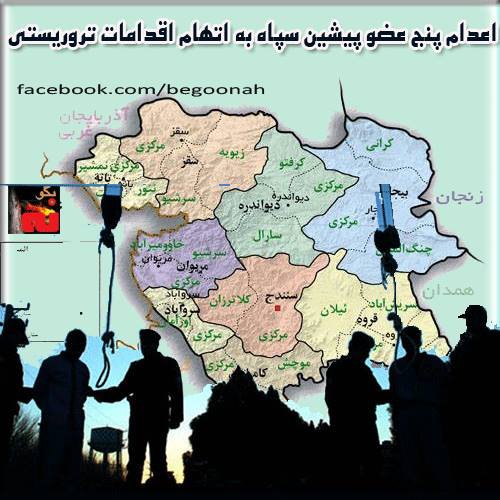 به اتهام اقدامات تروریستی ۵ متهم به اقدامات تروریستی که از پرسنل سپاه پاسداران محسوب میشدند در زندان مرکزی سنندج اعدام شدند. يكي از فرمانده هان سپاه كه دست اندركار ترور جوانان كرد، طي سالهاي اخير بود، بعد از خوش خدمتي نهايتا خودش نيز بدليل عدم لو رفتن اطلاعاتش به دار آويخته شد.
