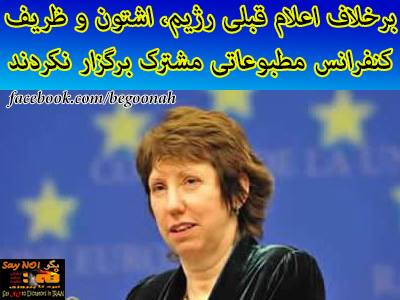 به دنبال پايان دو روز گفتگوی رژيم با کشورهای 5 +1، کاترين اشتون به همراه سخنگوی خود مايکل مان يک کنفرانس مطبوعاتی برگزار کردند. رژيم آخوندی از ظهر امروز در رسانه های خود مرتب اعلام می کرد در پايان مذاکرات، اشتون و ظريف کنفرانس مطبوعاتی مشترکی برگزار خواهند کرد. اما در پايان گفتگوها کاترين اشتون اين کنفرانس مطبوعاتی جداگانه و با حضور سخنگوی خود مايکل مان برگزار کرد.