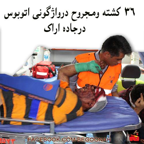بنا به گزارشات حکومتی در پي واژگونی اتوبوس مسافر بري در محور توره – اراک دو تن از مسافران کشته و 34 نفر نیز مجروح شدند.