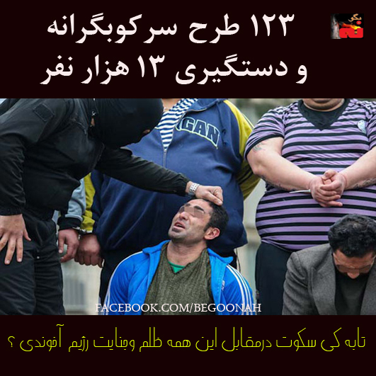 اخبار ۱۳۲ طرح سرکوبگرانه و دستگيری ۱۳هزار نفر Date: اکتبر 30, 2013Author: begoonah 0 دیدگاه پاسدار عزيزی سرکرده اطلاعات و امنيت نيروی انتظامی رژيم در استان هرمزگان از اجرای 132 طرح سرکوبگرانه خبر داد. وی گفت در چارچوب اين طرحها بيش از 13هزار نفر از مخلان امنيت دستگير شدند. اشتراکگذاری این:بیشتر برای اشتراکگذاشتن فیسبوک خود کلیک کنید (در پنجرۀ تازه باز میشود) فیسبوک اشتراک گذاشتن توسط اس ام اس (در پنجرۀ تازه باز میشود) X برای چاپ کردن کلیک کنید (در پنجرۀ تازه باز میشود) چاپ برای اشتراکگذاری روی Telegram کلیک کنید (در پنجرۀ تازه باز میشود) تلگرام برای اشتراکگذاری روی WhatsApp کلیک کنید (در پنجرۀ تازه باز میشود) واتساپ