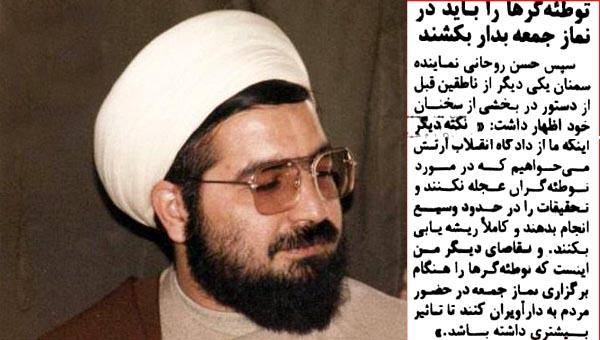 حسن روحانی در تیرماه ۱۳۵۹ گفت: «تقاضای دیگر من این است که توطئه گرها را هنگام برگزاری نماز جمعه در حضور مردم به دار آویزان کنند تا تاثیر بیشتری داشته باشد!»