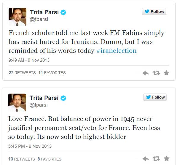 در حالی که مذاکرات هسته ای در ژنو در بن بست قرار گرفته است، فرانسه مورد حمله شدید روزنامه های رژیم جمهوری اسلامی قرار گرفته و لورانت فابیوس وزیر خارجه فرانسه مسئول بن بست مذاکرات و بعنوان عروسک نتانیاهو معرفی شده است! تریتا پارسی و نایاک و سایر لابی های طرفدار جمهوری اسلامی در واشنگتن هم یک کارزار دروغ پراکنی و فحاشی بر علیه فرانسه و وزیر خارجه اش بر پا کرده اند. تریتا پارسی در توئیتش، لورانت فابیوس را نژادپرستی ضد ایرانی و فرانسه را کشوری